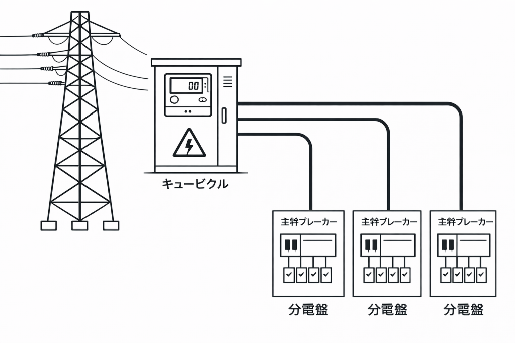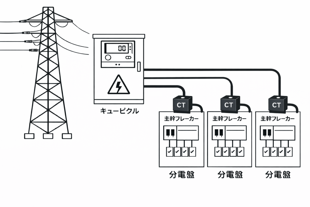 キュービクルで高圧受電し、単相100V(電灯)や三相3線200V(動力)に降圧したのち「フィーダー」で各分電盤に配電します。理論上、全てのフィーダーの電力量の和が受電量と等しくなります。