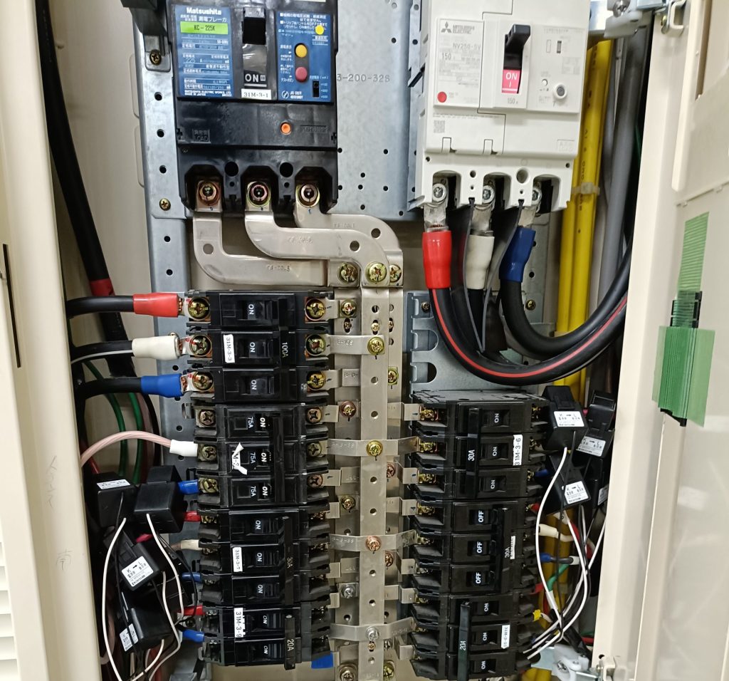 設備側の分電盤においては、主幹ブレーカーより上流側にwattXplorerを取り付けます。下の写真では右側の白色の筐体が主幹ブレーカーです。