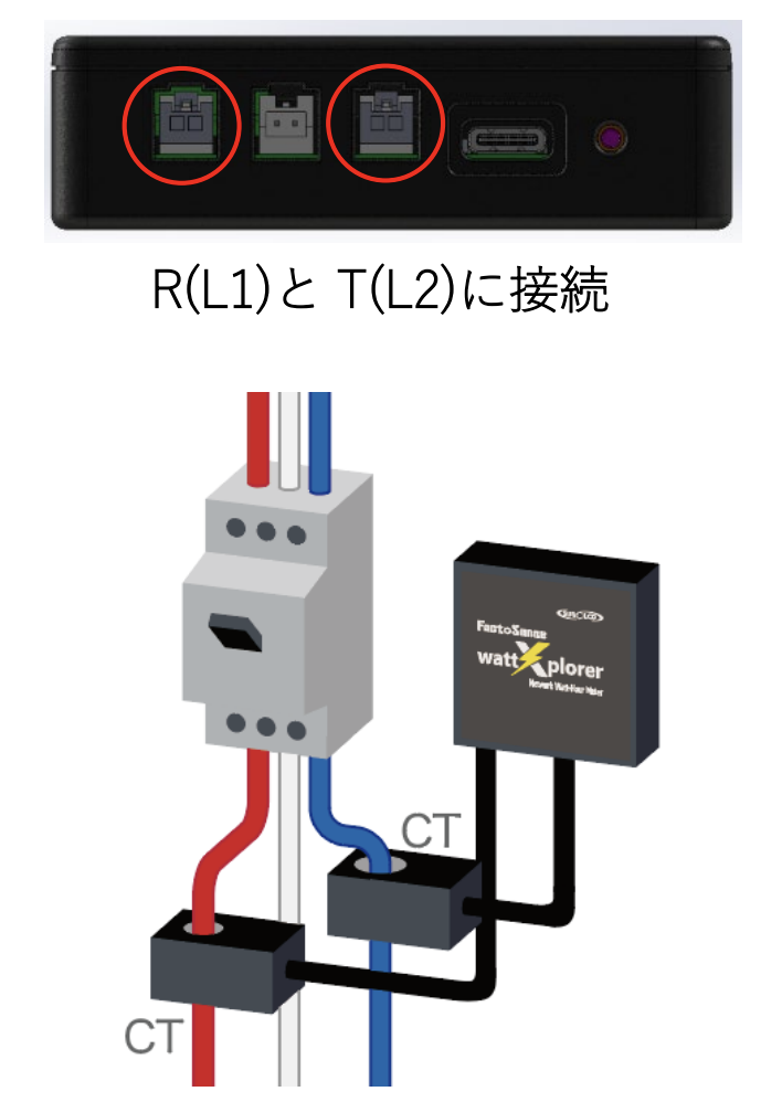 当社明石工場でキュービクル側の分電盤に合計35個のwattXplorerを取り付けました。三相3線式の場合はイラストのように1回路につき2個のCTクランプを取り付けます。