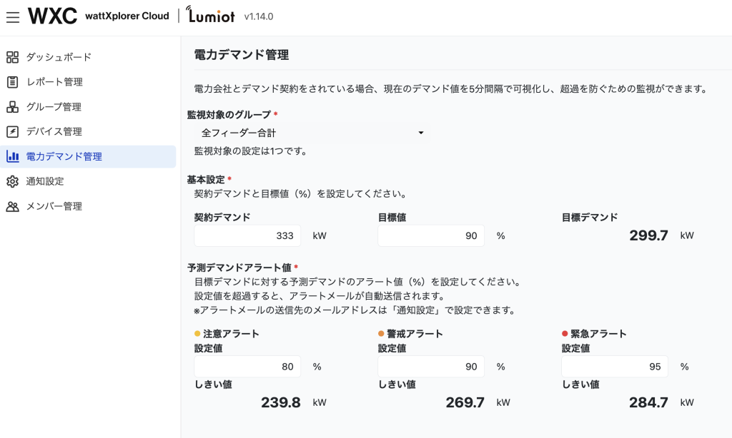 電力会社との契約デマンドや監視の目標値(%)を設定します。 - 注意アラート: