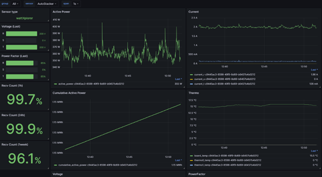 wattXplorerは計測データをWi-Fiで通信し、リアルタイムでクラウドやサーバーに蓄積します。 導入前、横道様は「金属製の制御盤の中に設置して、果たして電波が飛ぶのか?」「工場の巨大なモーターから出るノイズでデータが化けないか?」という懸念を抱いていました。しかし、実際に設置してみると、その不安は一掃されました。 日本の制御盤には配線用の穴があり、そこから電波が効率よく抜けるため、金属に囲まれた環境下でも10メートル以上離れたルーターまで安定してデータを送信できたのです。工場特有の過酷なノイズ環境下でも、wattXplorerは途切れることなくデータを刻み続けました。