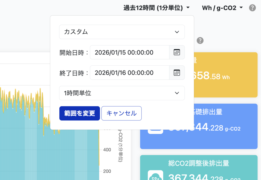 次にWXCで同じ期間の電力量を表示させます。電力デマンド監視用のグループを設定している場合は、あらかじめそのグループのグラフを表示しておきます。下図では1月15日の24時間で期間指定をしています。この期間でのWXCの測定値は約3,063kWhです。